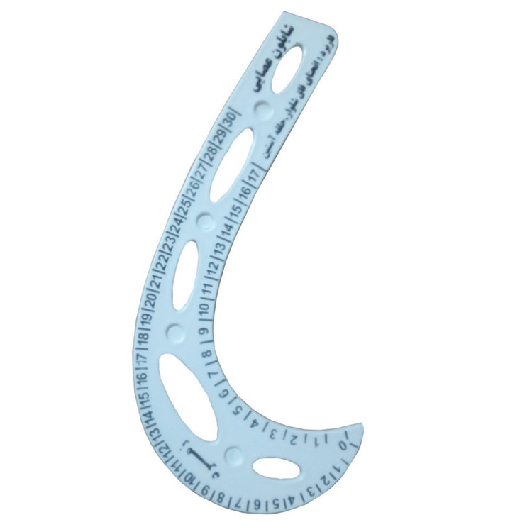 شابلون عصایی خیاطی مناسب جهت طراحی انحنای فاق شلوار است . در قسمت برجسته خط کش می توان برای طراحی دکوپ لباس استفاده کرد . از قسمت تو رفتگی خط کش برای طراحی حلقه لباس از آن بهره برد.